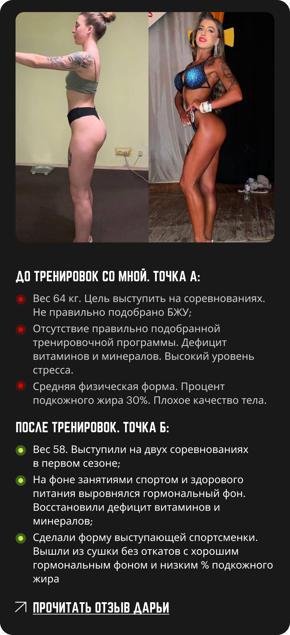 Разработка уникальной тренировочной программы под вашу цель и примеры меню, расчёт БЖУ, рекомендации по витаминам и БАДам