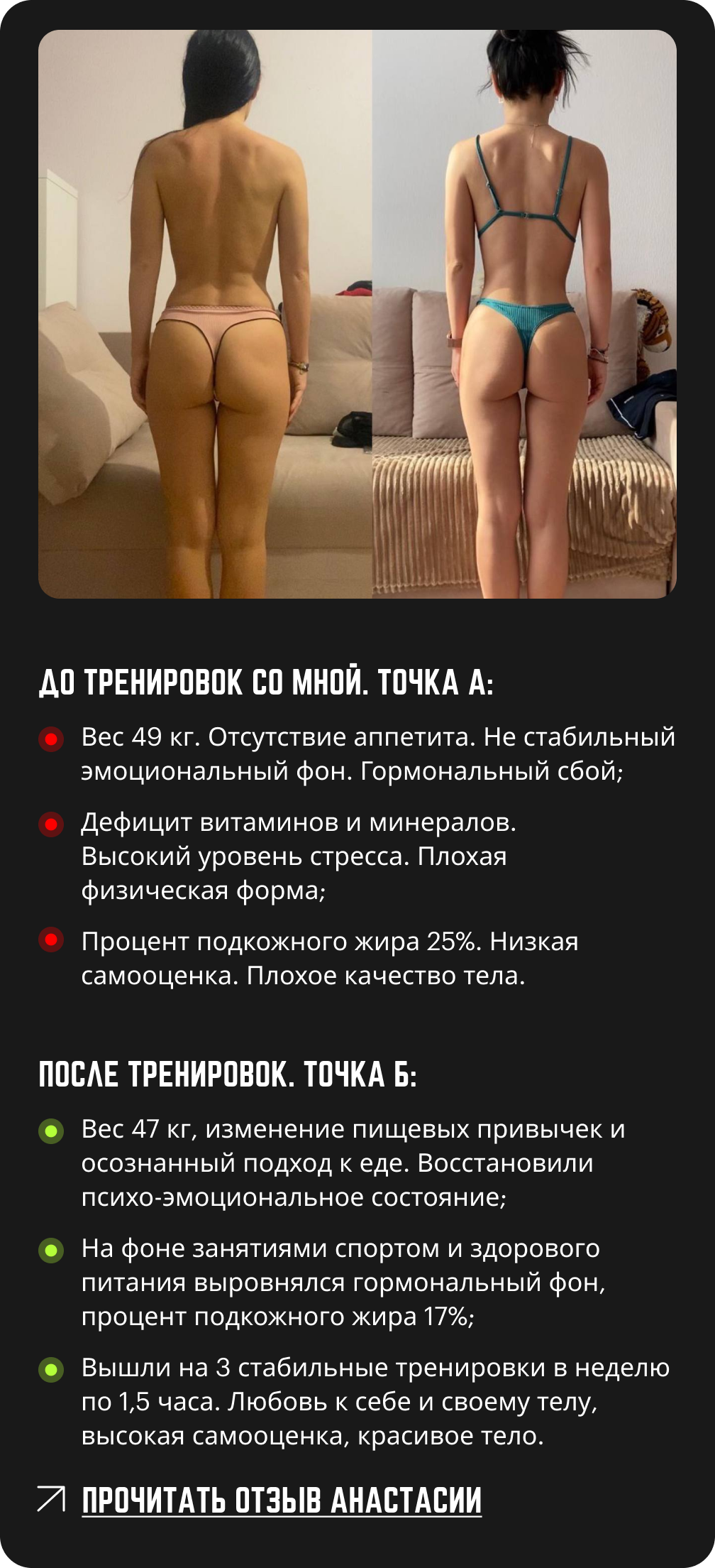 Прийти к форме вашей мечты - это не равно большие физические нагрузки. Это система и выполняя каждый шаг этой системы мы придем к вашему результату без напрягов вместе